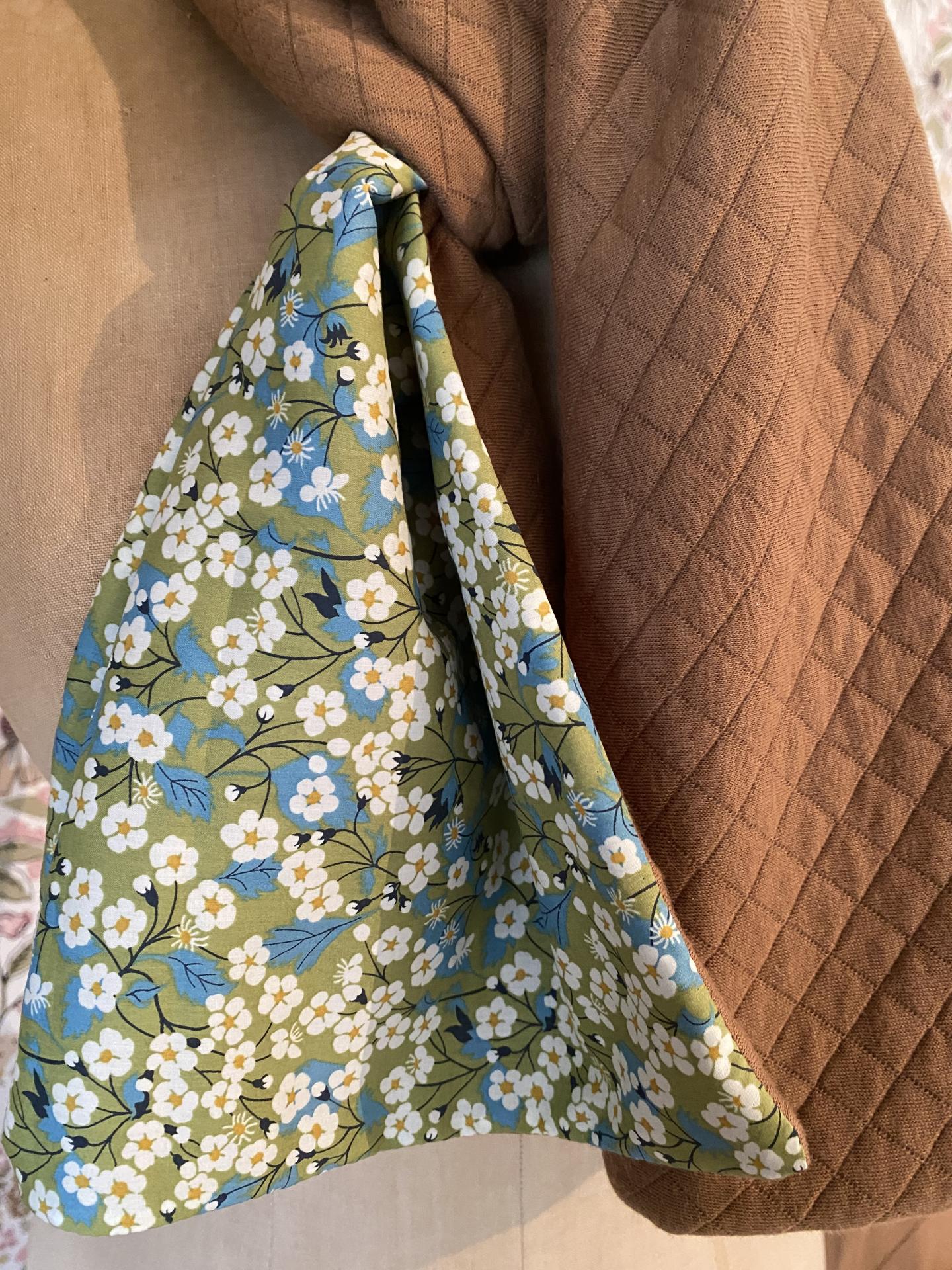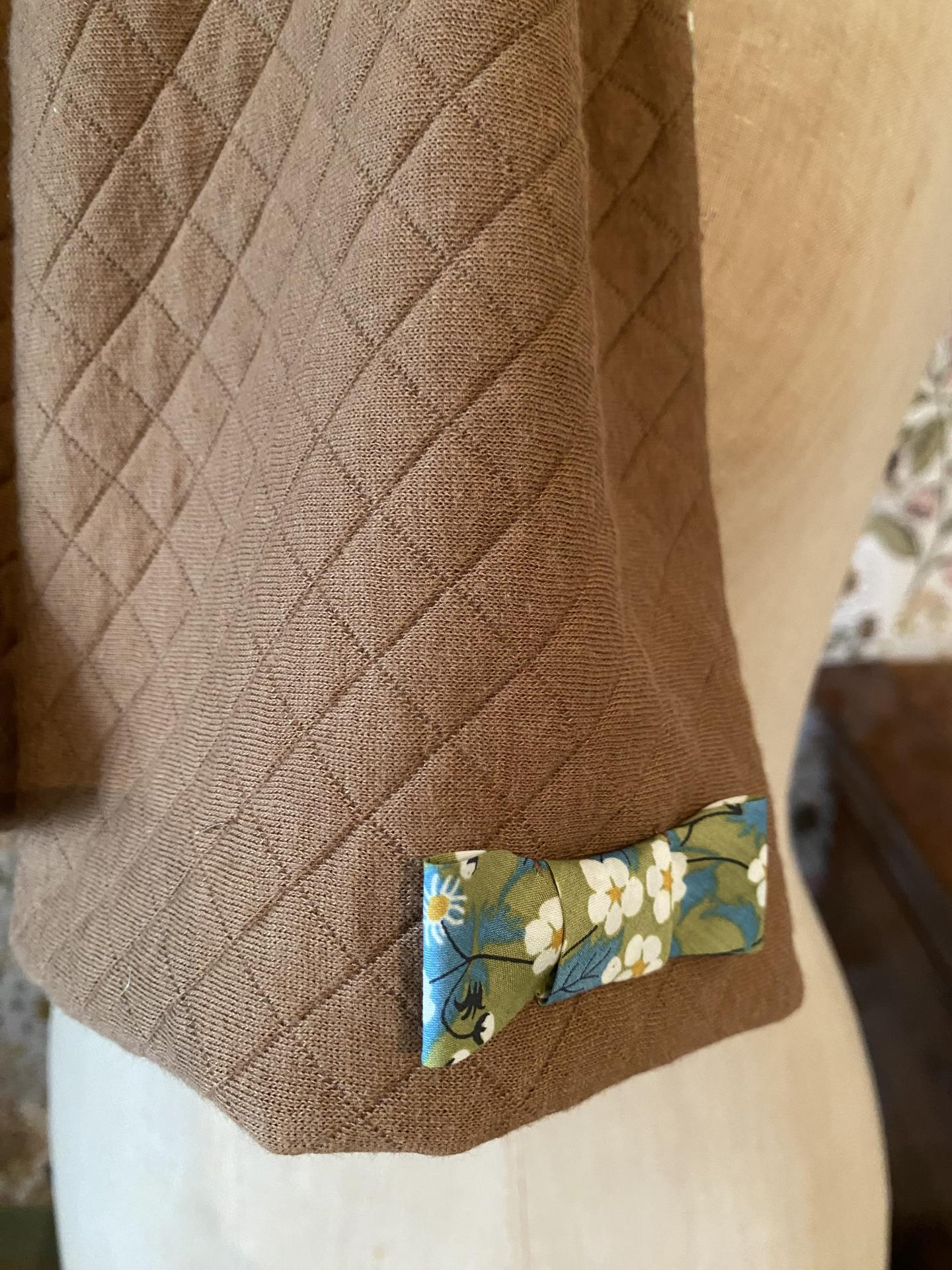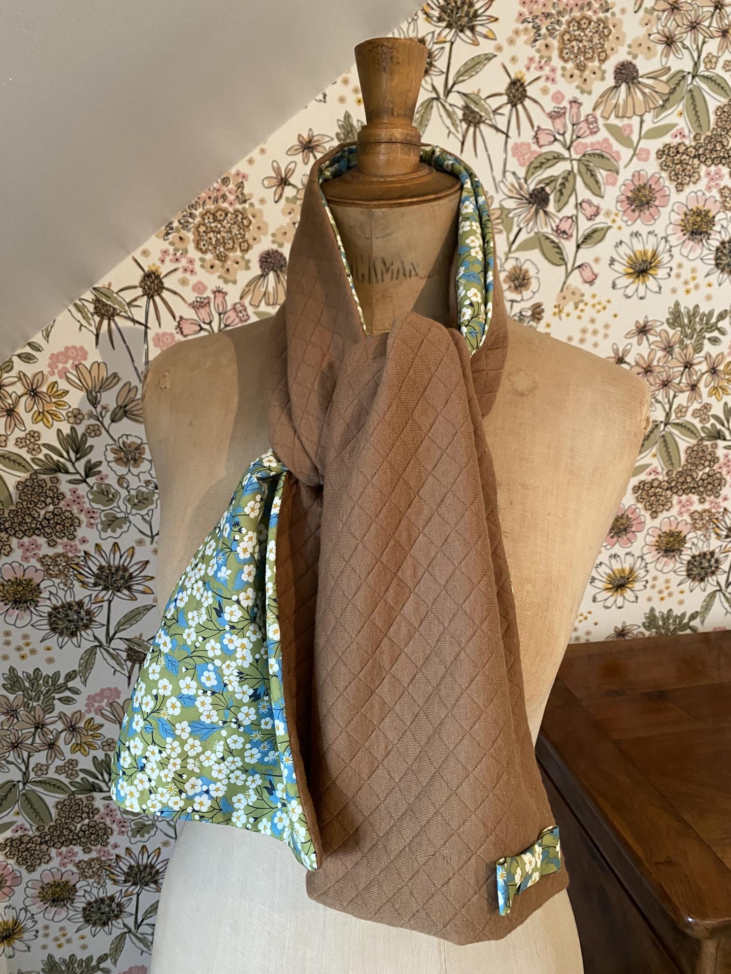 Echarpe en jersey matelassé caramel, doublée en Liberty Mitsy vert, petit noeud biais assorti