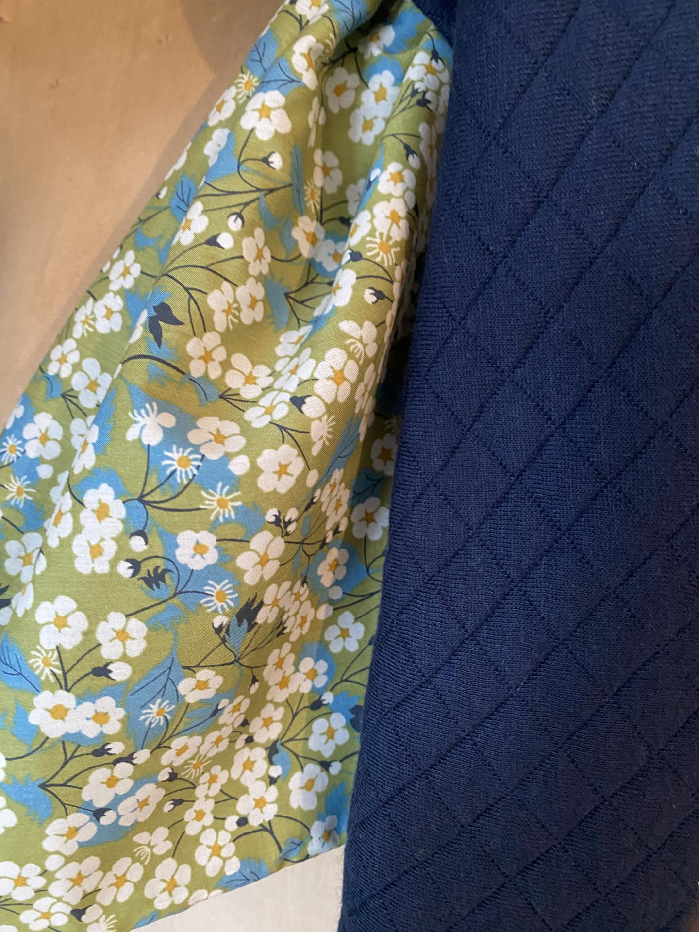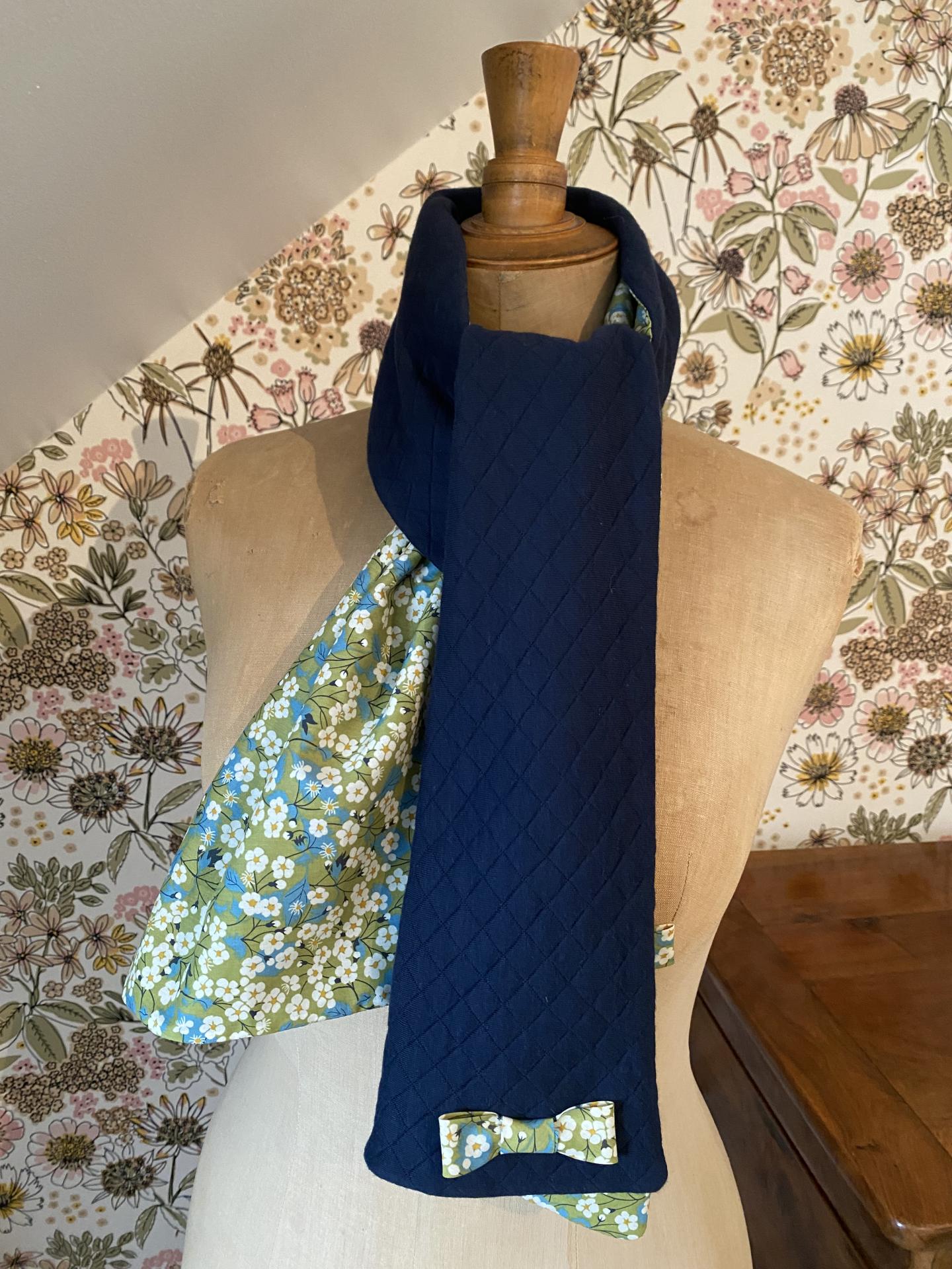 Echarpe en jersey matelassé marine, doublée en Liberty Mitsy vert, petit noeud biais assorti